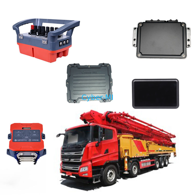 泵车电控系统包含万能型泵车遥控器、接收器、控制器、IO模块和工业显示屏。