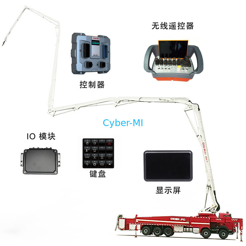 举高喷射消防车电控系统包括以下几个产品:无线遥控器、控制器、IO模块、键盘和显示屏。